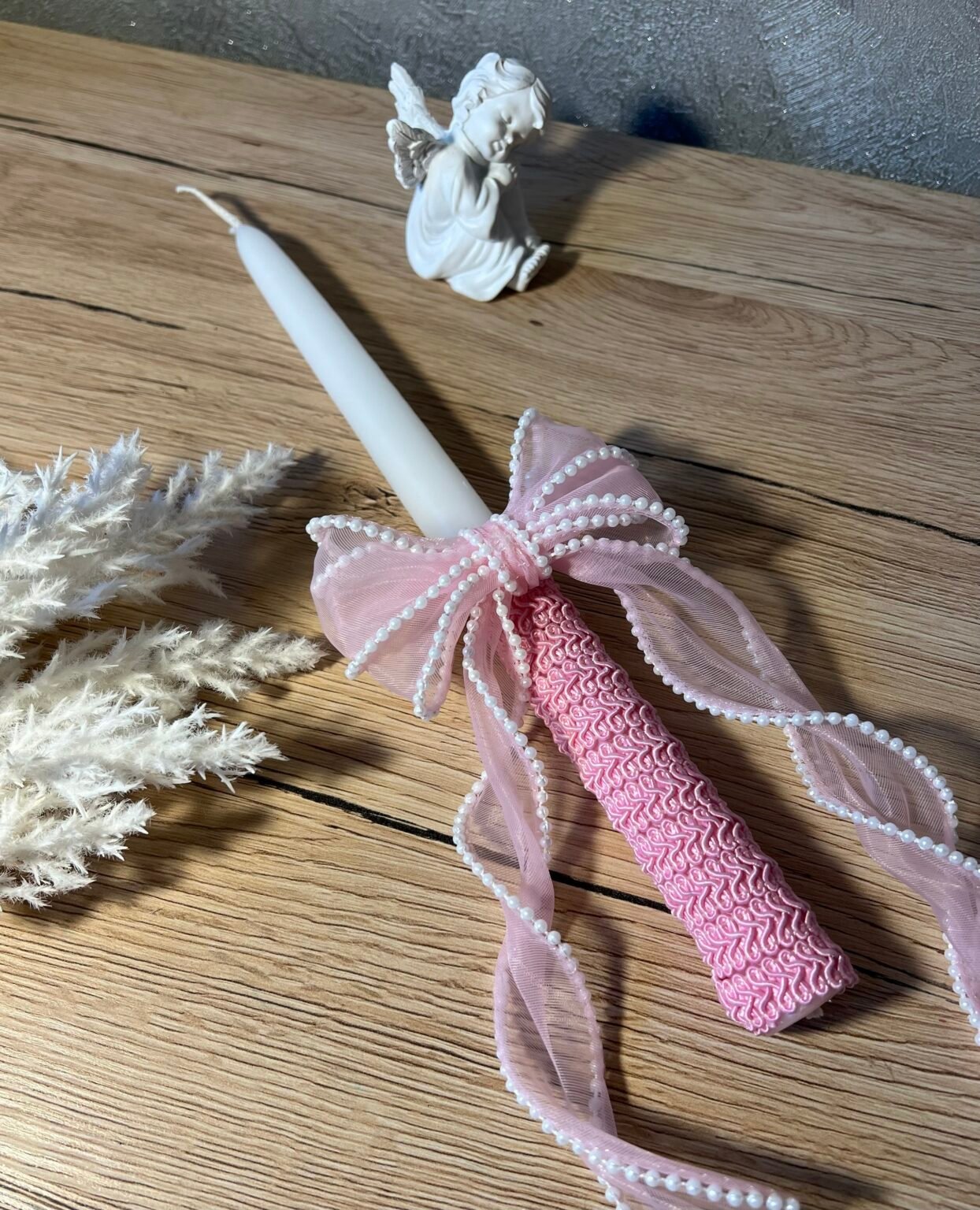 Krikšto žvakė su rausvu kaspinu