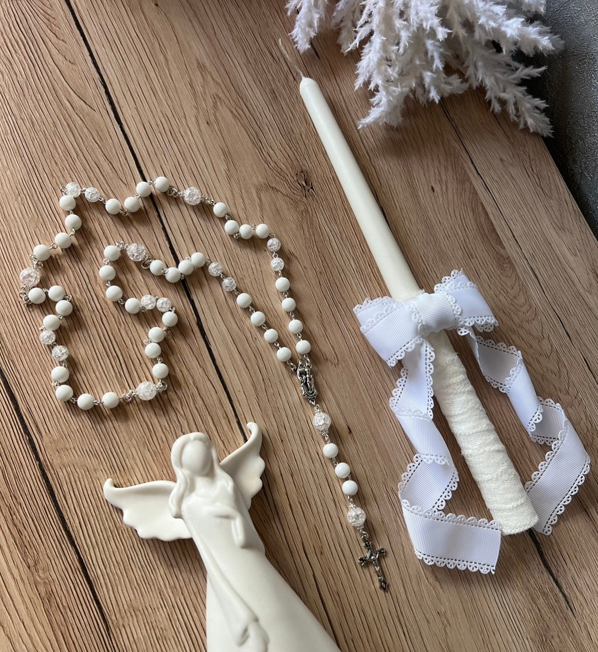 Rinkinys krikšto žvakė su baltu kaspinėliu ir rožančius
