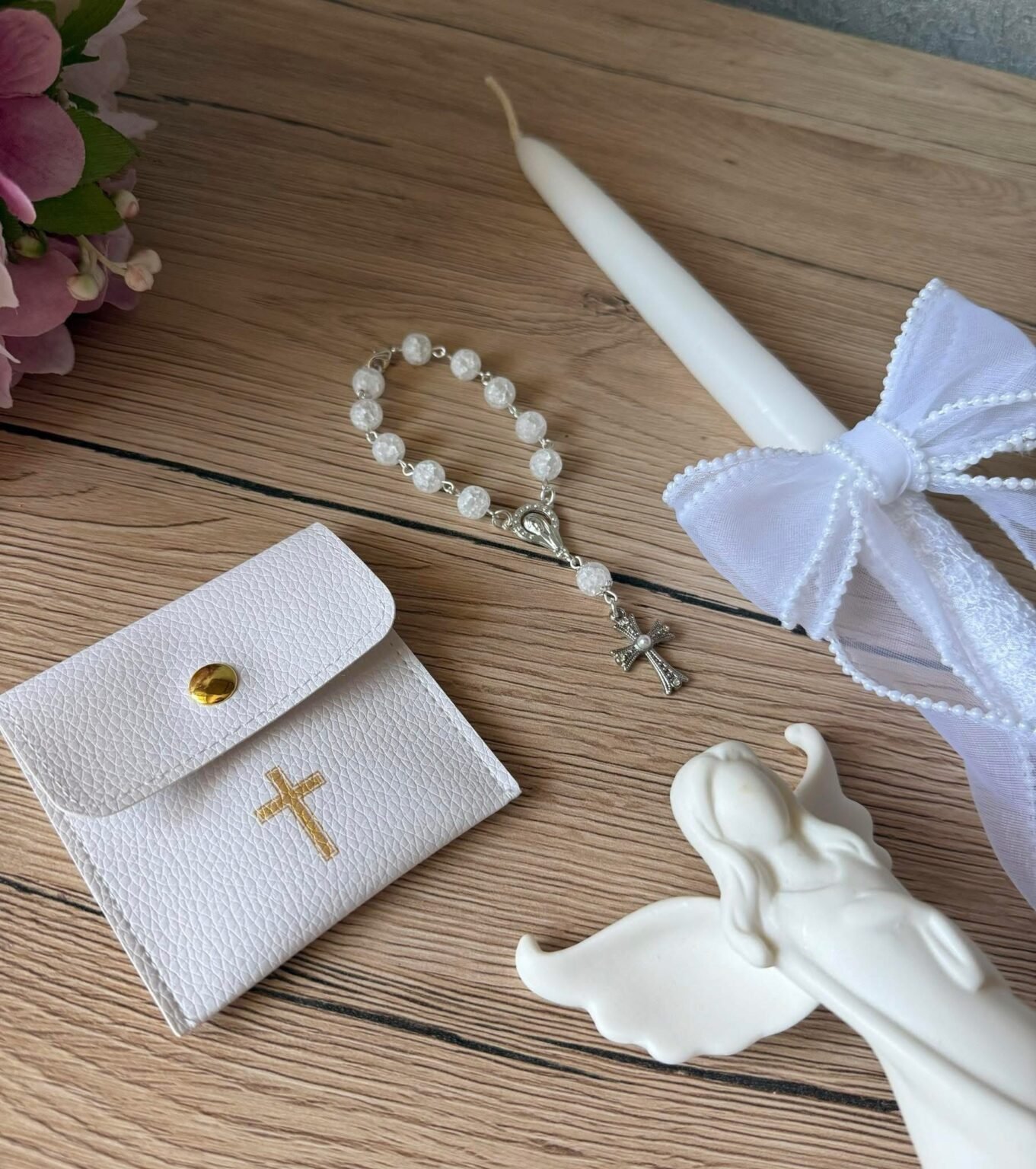 Rinkinys Krikštui – žvakė, rožančiukas ir dėkliukas