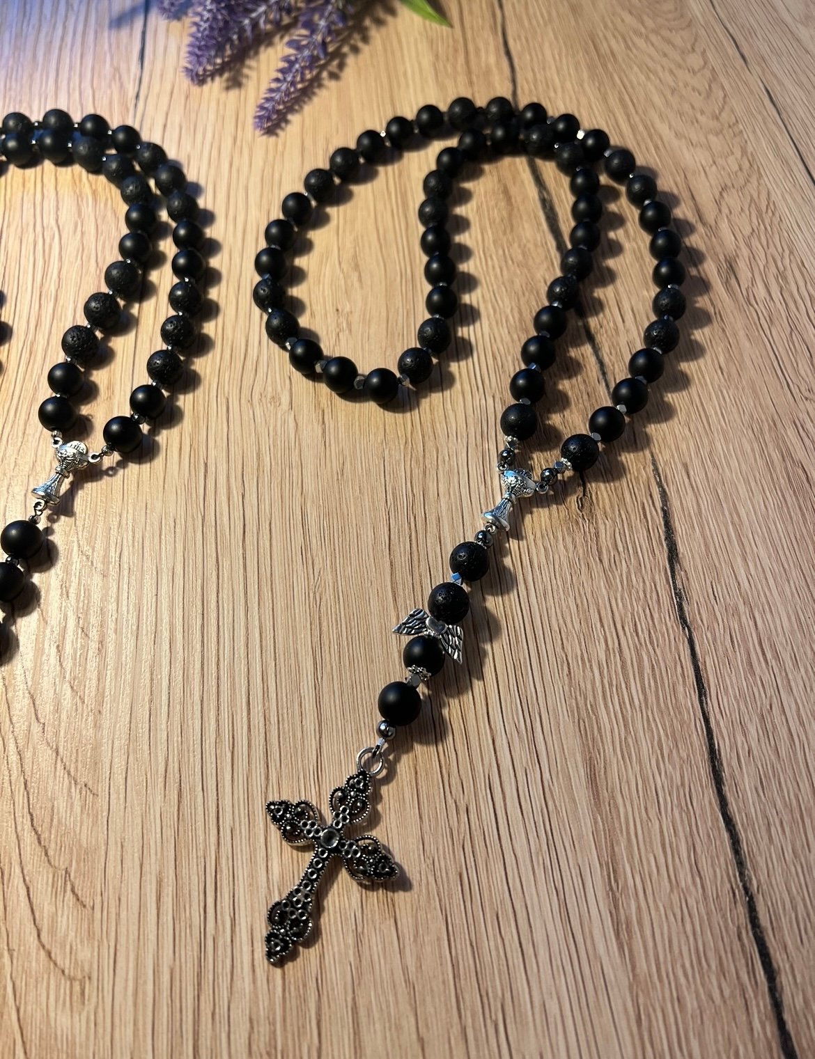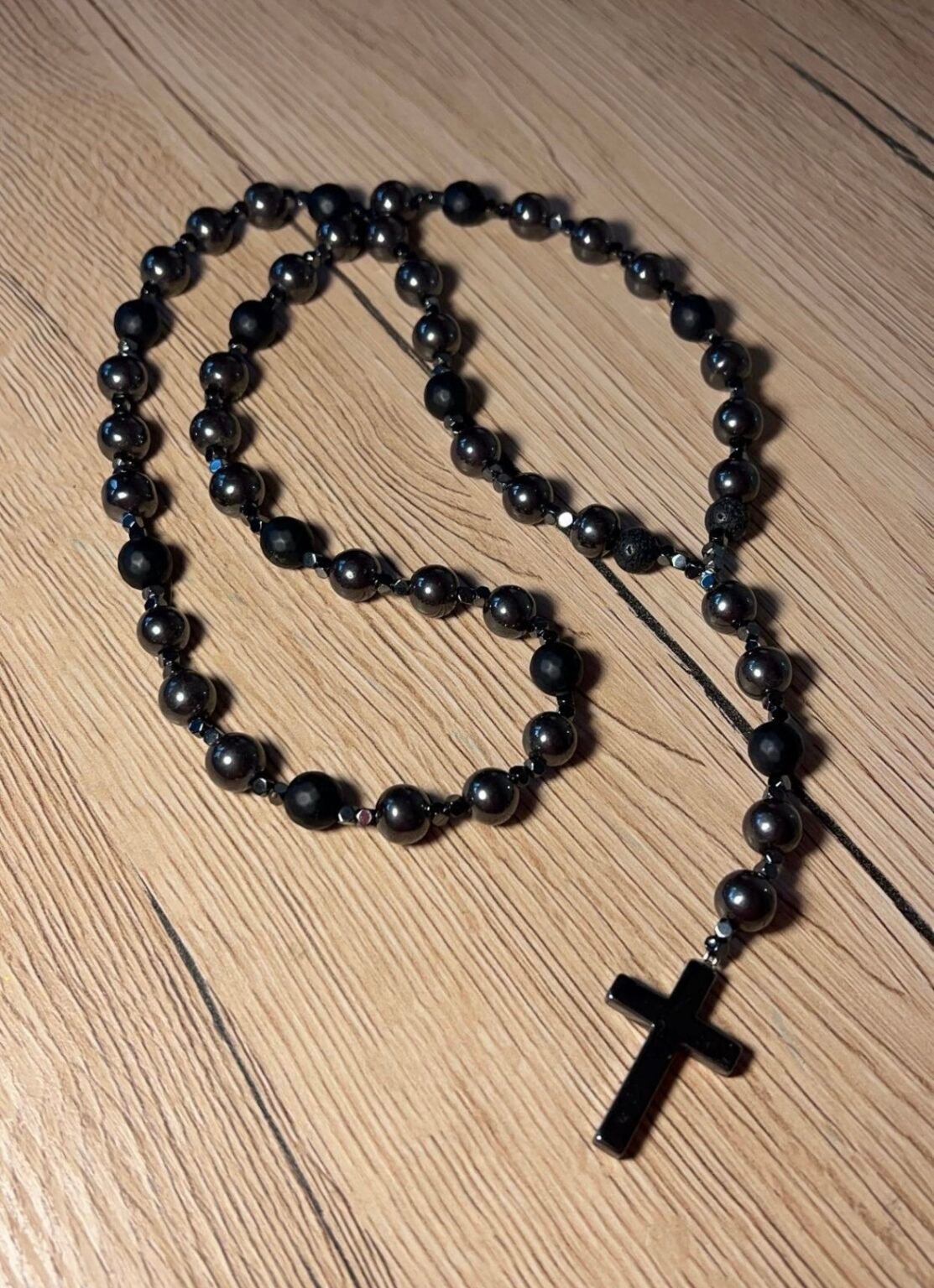 Vyriškas rožančius iš lavos ir šungito karoliukų su hematito kryželiu