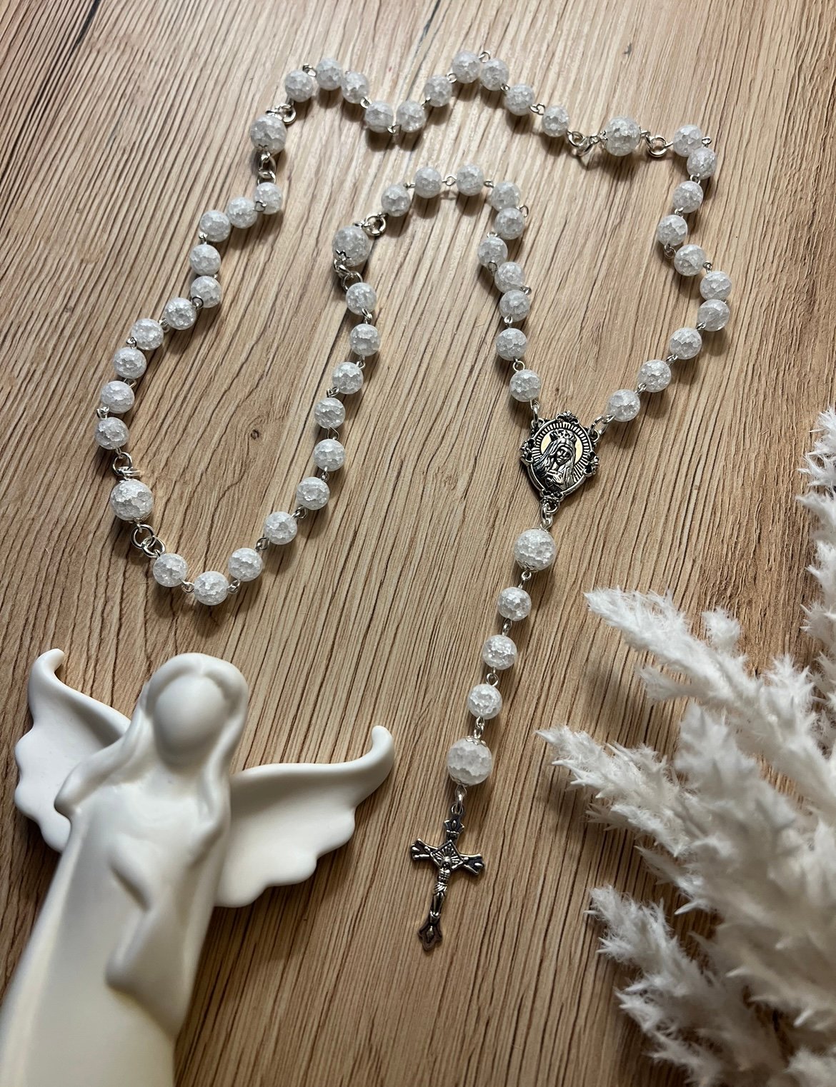 Rožančius iš balto kalnų krištolo karoliukų su sidabro spalvos detalėmis