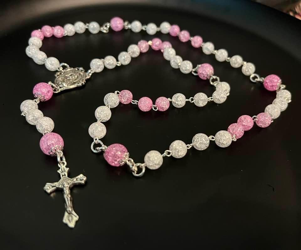 Rožančius iš kalnų krištolo karoliukų su sidabro spalvos detalėmis