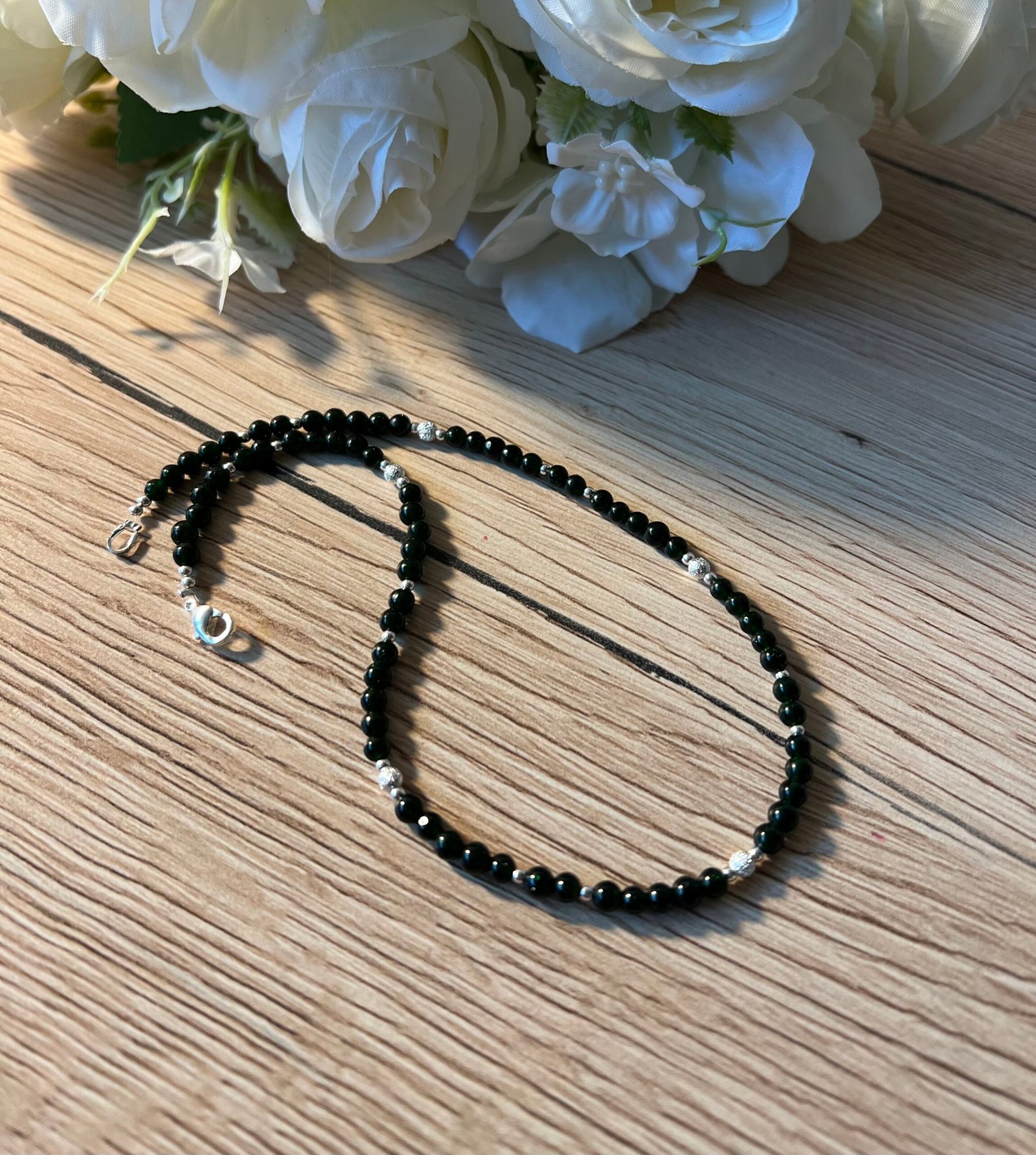 Rankų darbo vėrinys iš nilo smaragdo karoliukų ir aukštos kokybės detalių.