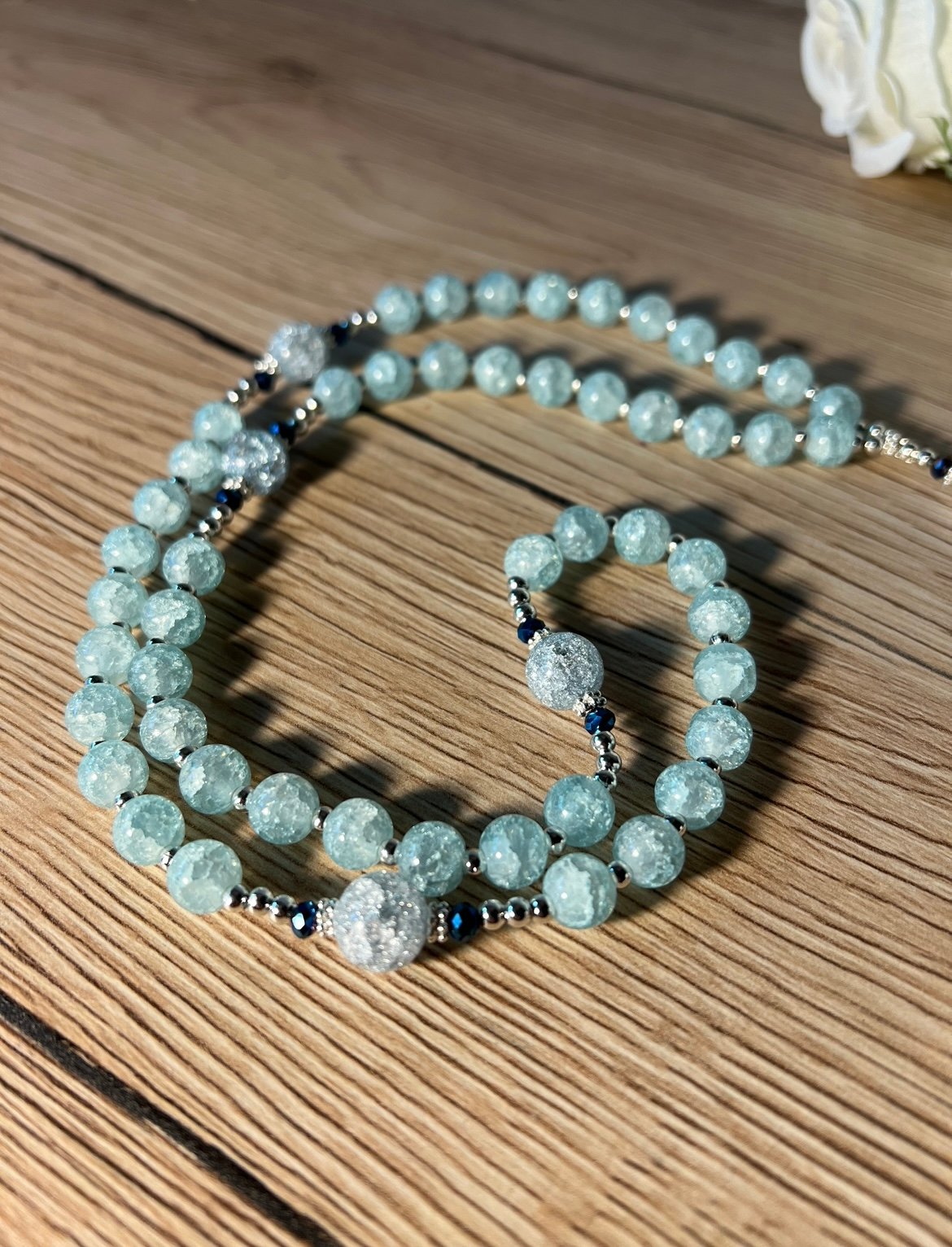 Taisyklingas žydras kalnų krištolo 8-10 mm rožančius su sidabro spalvos detalėmis