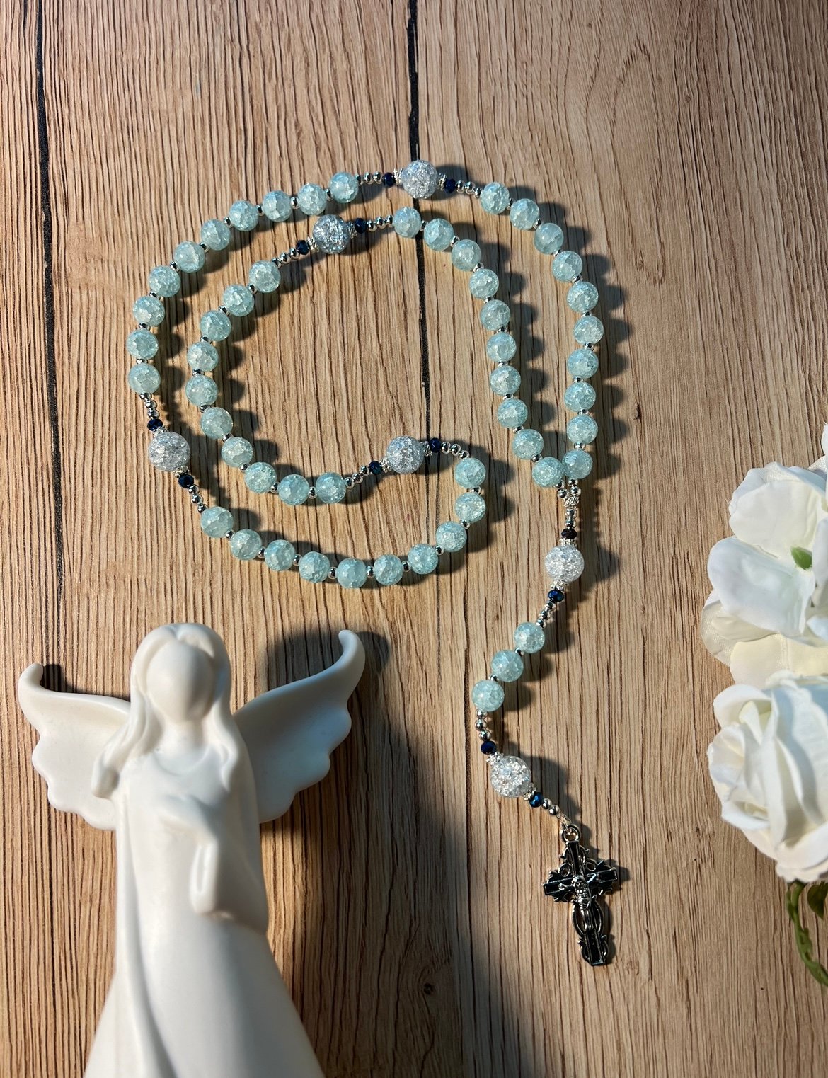 dovana krikstynoms berniukui rožančius.jpegKalnų krištolo rožančius su sidabro spalvos detalėmis