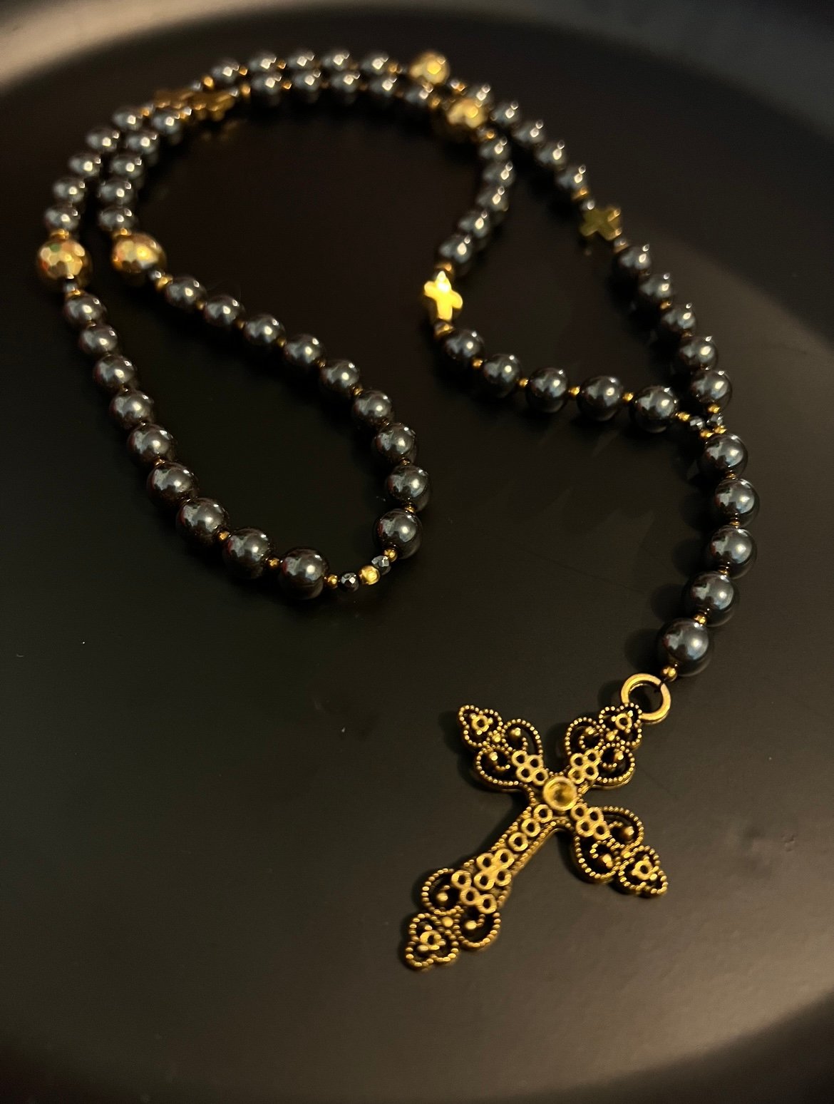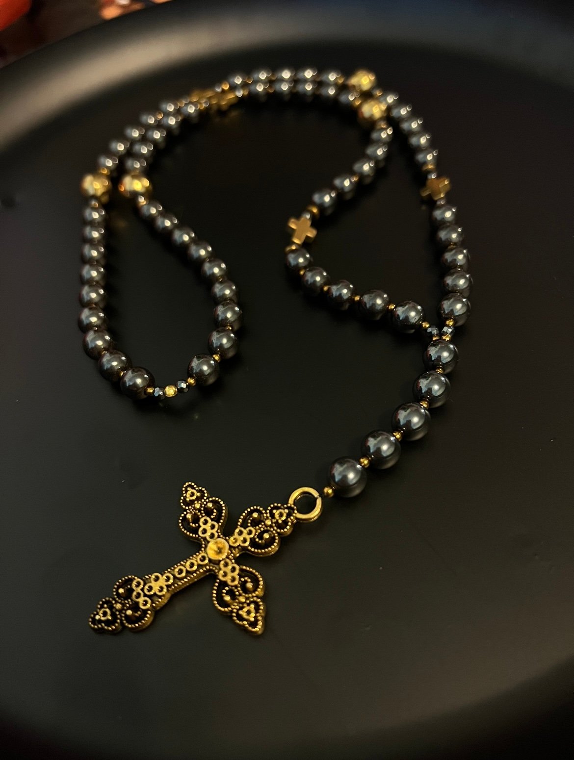 Rankų darbo rožančius iš 8 mm hematito akmens karoliukų ir aukso spalvos aukštos kokybės detalių